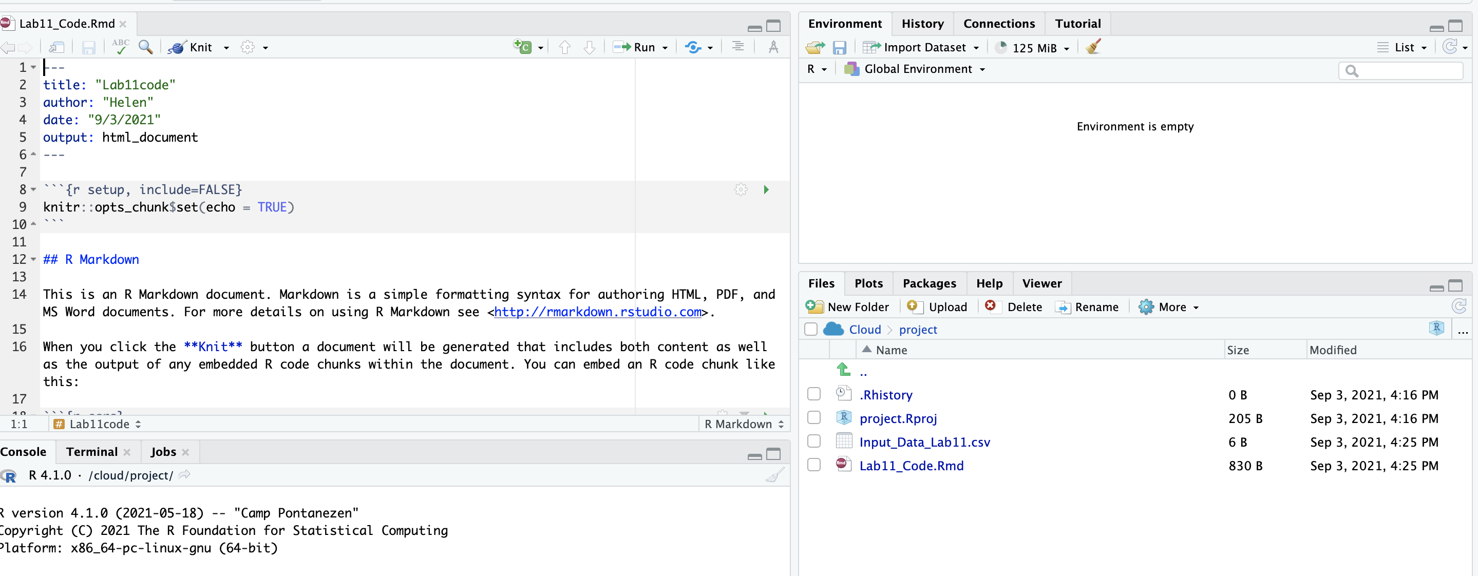 4. Click on the .Rmd file name in the files in RStudio and you’re good to go